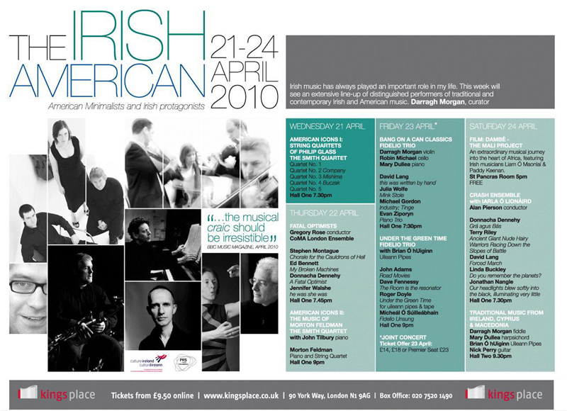 The Irish-American: Concert with Fidelio trio King's Place London,April 23rd and 24th As part of this festival featuring aspects of new Irish and American music,Brian will be performing with the Fidelio rio for Under the Green time on Friday the 23rd April and with Darragh Morgan, Mary Dullea, and Nick Perry for a concert of Traditional Music on Saturday the 24th